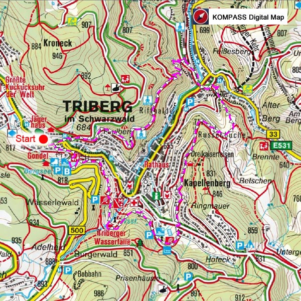Diese Rundwanderung kann von mehreren Stellen aus begonnen werden. Parkplätze findet man am Bahnhof, beim Schwimmbad oder am Bergsee. Beginnt man am Bahnhof, wird der Aufstieg gleich am Anfang der Runde bewältigt. Beim Beginn am Bergsee geht man auf dem ebenen und bequemen Panoramaweg bis zur ehemaligen Bahnaussicht. Auf diesem Teilstück hat man immer wieder schöne Ausblicke nach Triberg. Bei der Bahnaussicht zweigt ein Weg nach rechts abwärts zum Bahnhof ab. Er sollte nur mit Wanderschuhen begangen werden. Am Bahnhof kann eine Dampflock besichtigt werden. Hier beginnt auch der empfehlendswerte Schwarzwaldbahn Erlebnispfad. Nun weiter auf der Strasse zum Gerwigdenkmal. Ab hier wandern wir nun bergauf über Pavillion, Schützenhaus, Russenbuche zum Kapellenberg. Über einen schmal und aufsteigenden Pfad kann der Weg zur Russenbuche abgekürzt werden. Vor der Russenbuche gehen wir über die Kesselbergverwerfung die vor ca. 270 Mio Jahren entstanden ist. Ein aufwärts führender Weg bringt uns zum Kapellenberg. Nun eben weiter bis oberhalb des Waldsportbades. Hier kann im Sommer das herrlich gelegene Bad besucht werden. Als nächstes wird die Rodelbahn überquert. Über den Triberger Wasserfall gelangen wir dann zum Bergsee zurück.